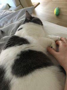 たまに触られたくない気分のときとか興奮しているときとかに撫でると、ワタシの手をガツッと掴んでガブッと噛んできますが、すぐに「これダメなんだっけ」と噛んだ場所をぺろぺろ舐める。