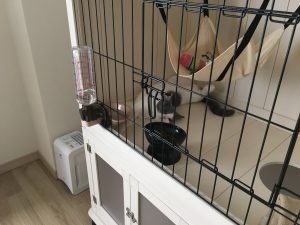 現在は、ケージの隣のキャビネットにトイレ用品や掃除用品を収納しています。