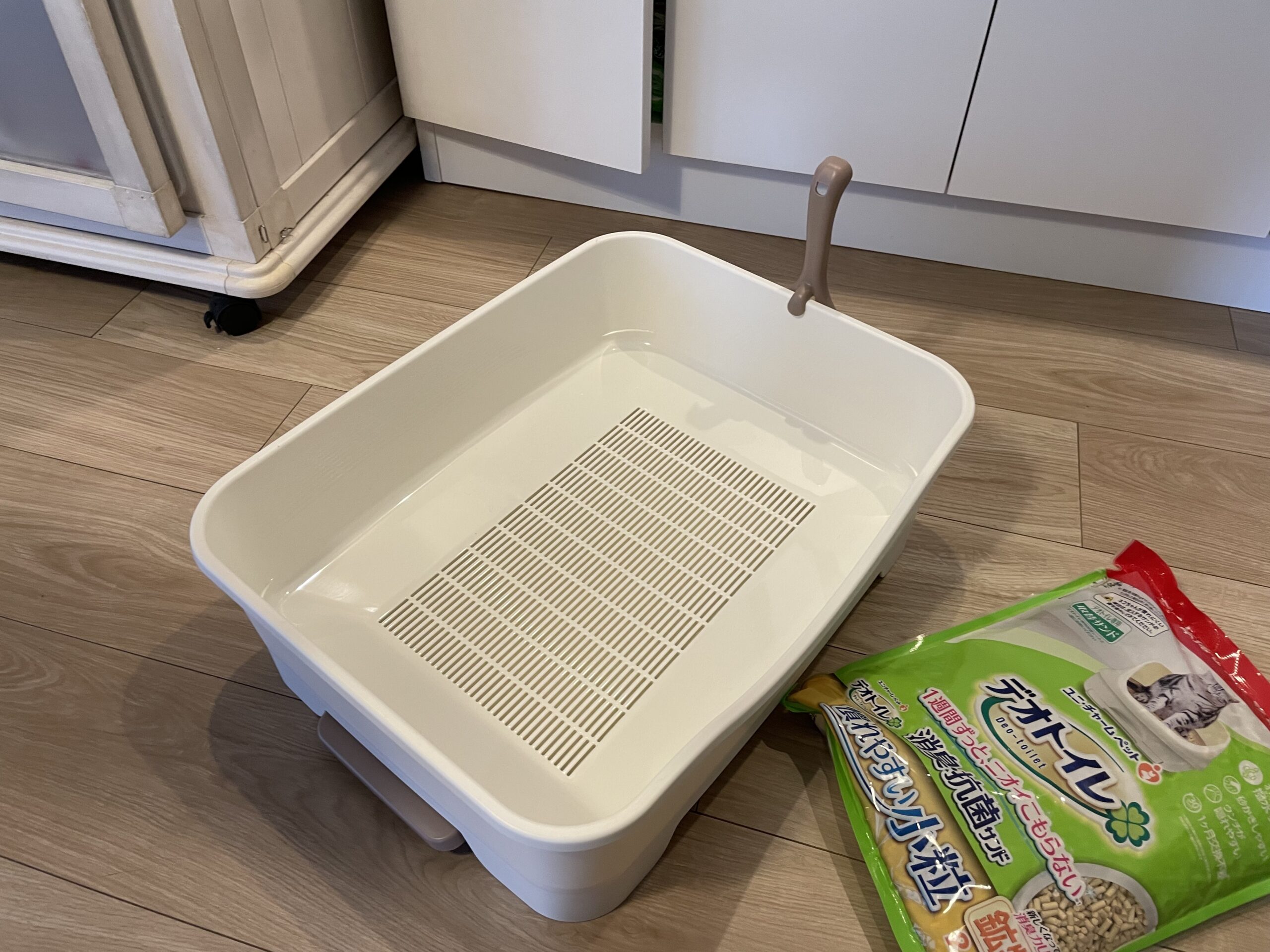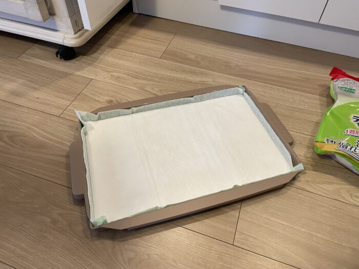 ブリ男のトイレ本体は、長年ニャンとも清潔トイレを使っていました。そこにデオトイレの砂とシートをセットして、無理矢理使用。