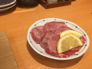 というわけで、突き出しがいきなり牛タンです(上の写真)。熱した石でジュッと焼いて、塩やレモン汁で頂きます。美味!