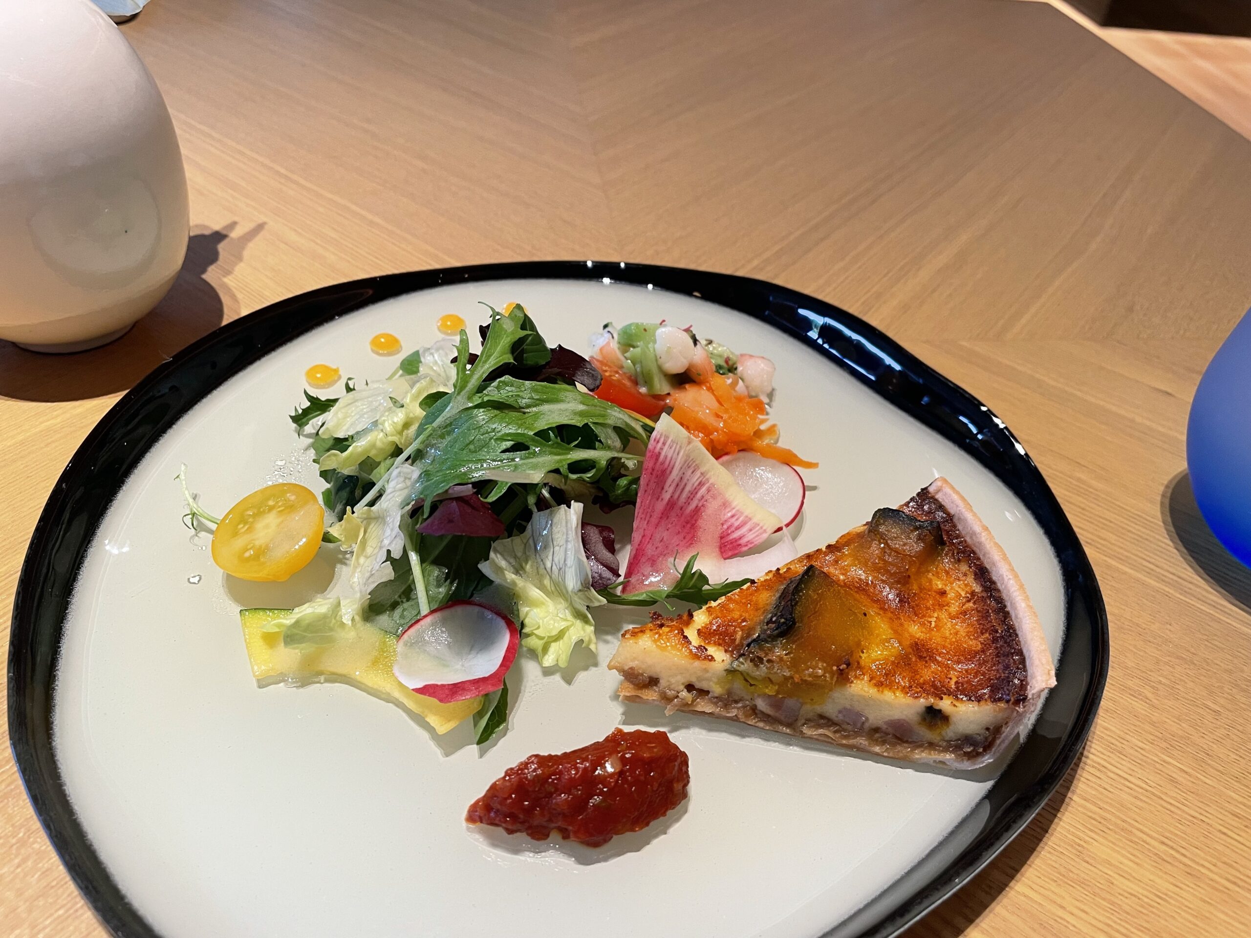 地元野菜のサラダに、カボチャやハムなどが入ったキッシュです。