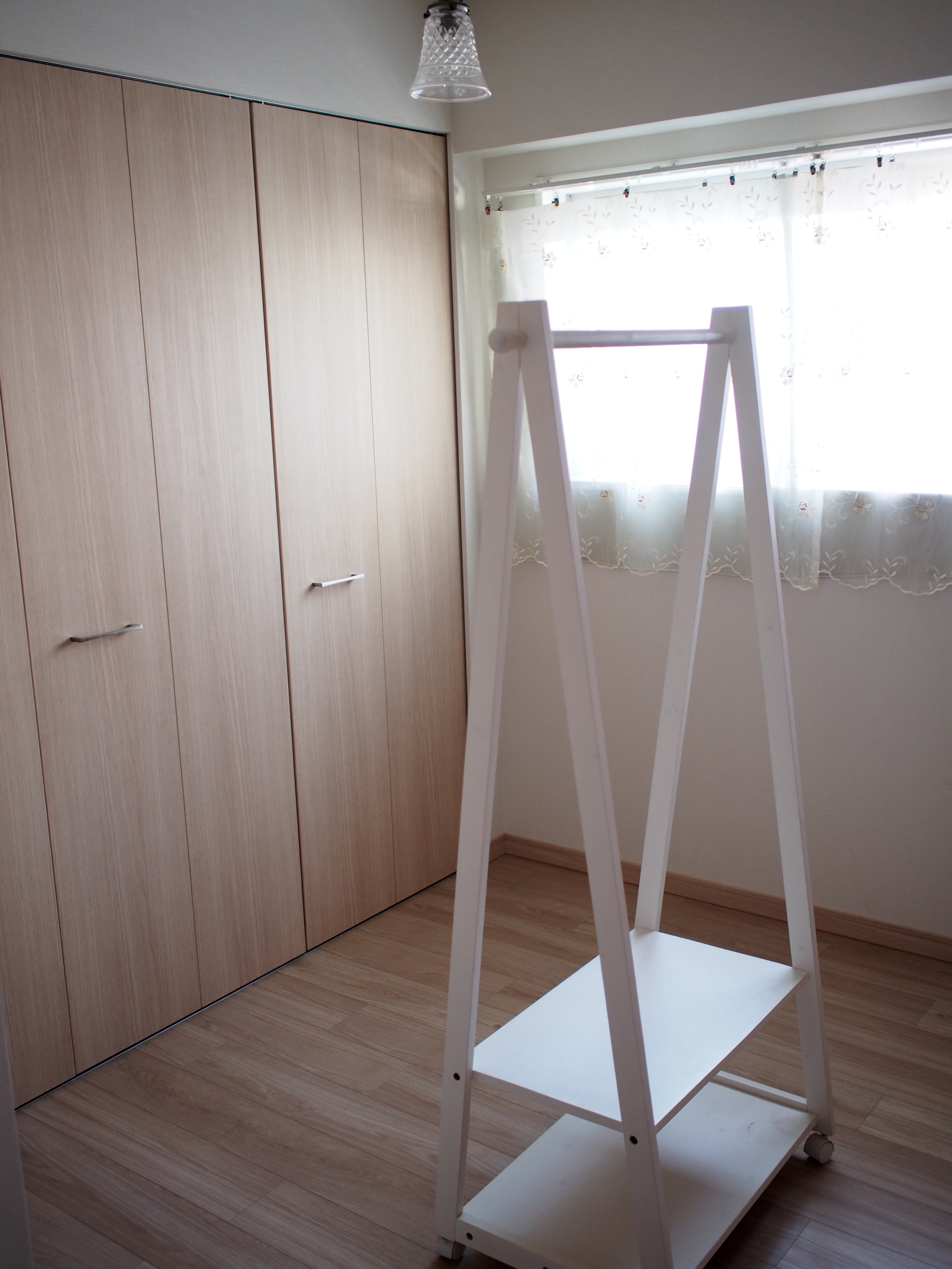 部屋の中央にはハンガーラックを置いて、どの収納へのアクセスもストレスがないようにしています。