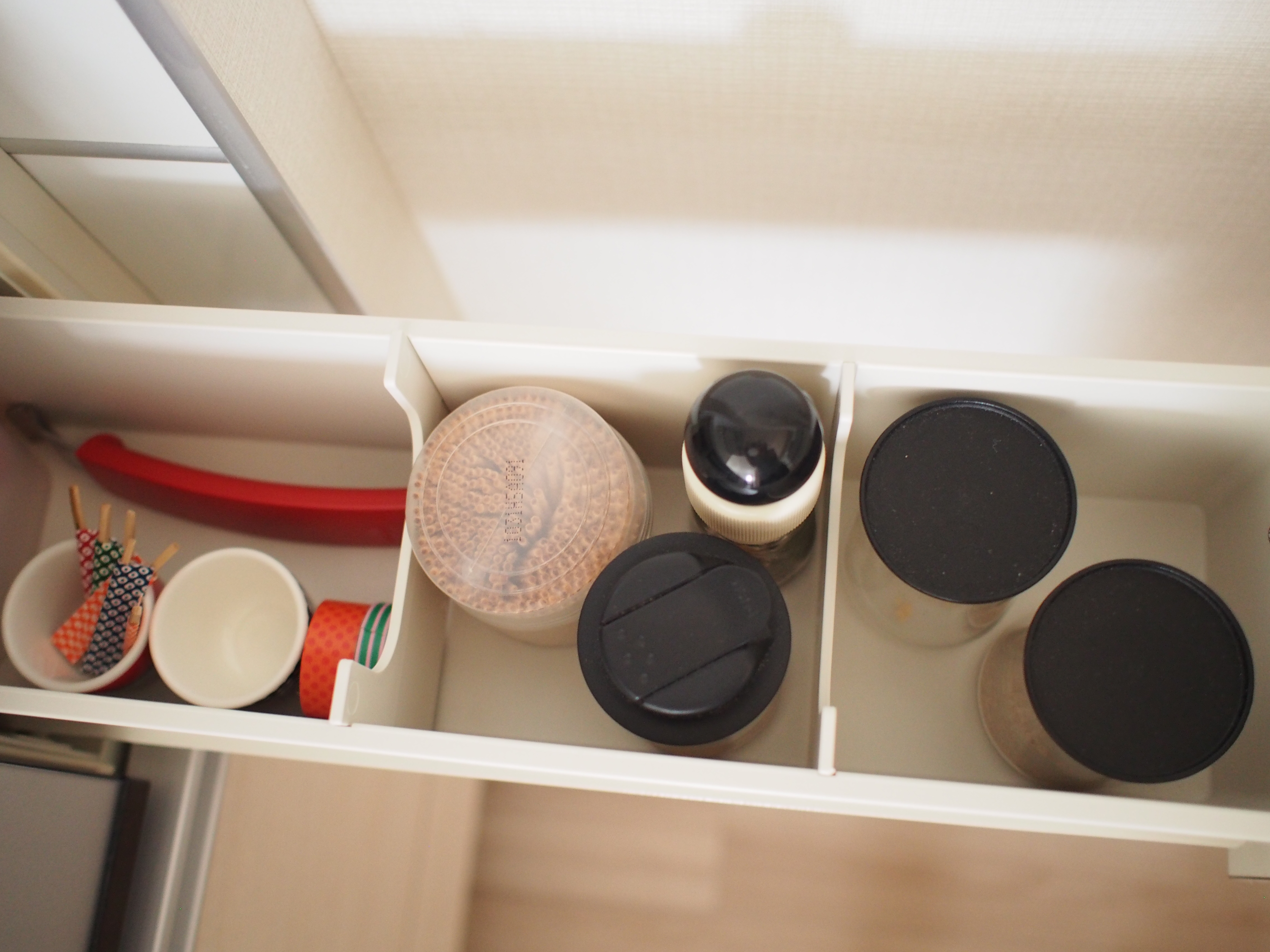 スパイスボトルだけでなく、マスキングテープやグリルインロースターの取っ手なども収納しているので、なかなかカラフルなことになっています。