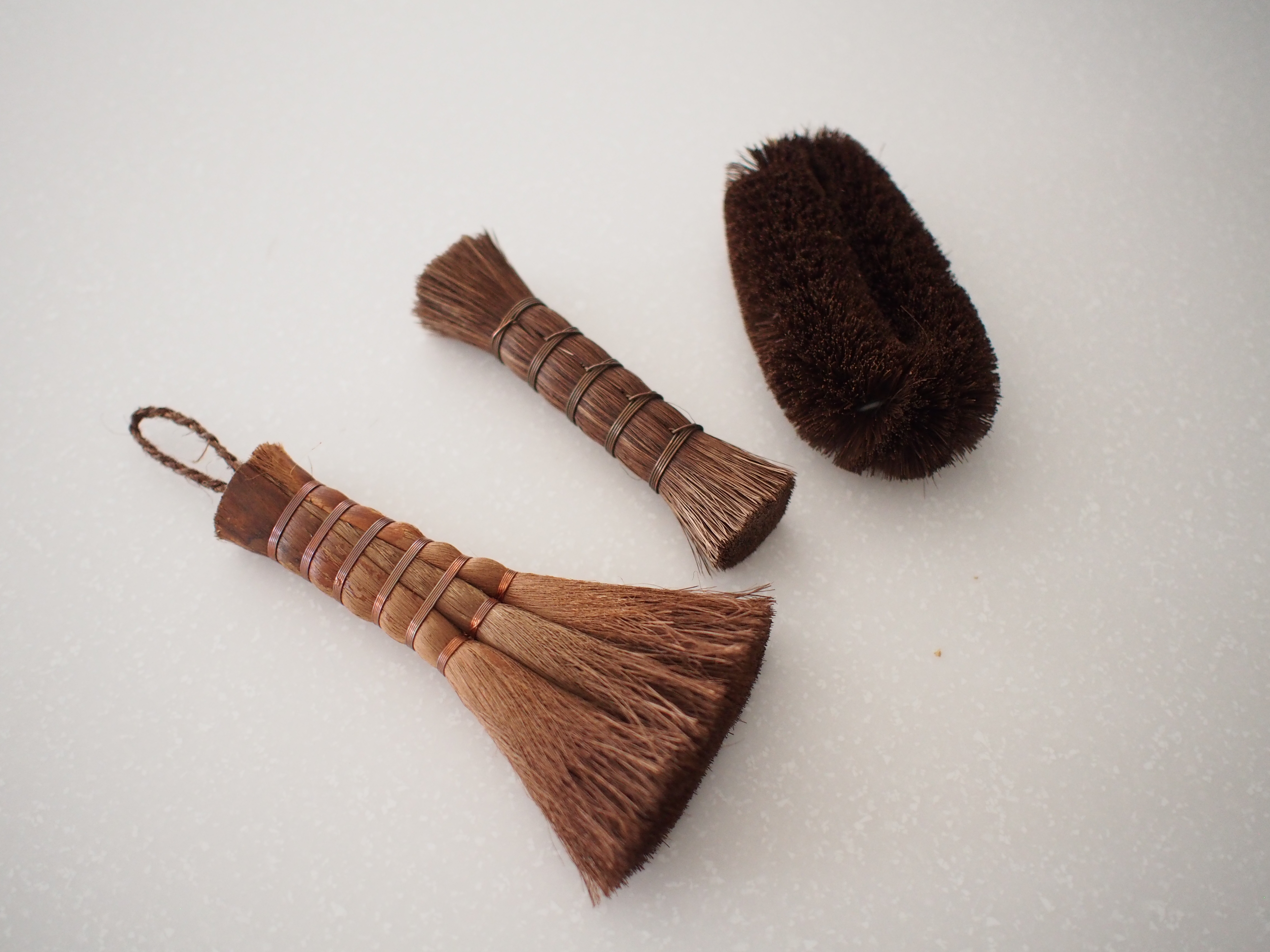 根菜用の亀の子タワシ、鍋や食器のこびりつきを取るささら、テーブル箒。