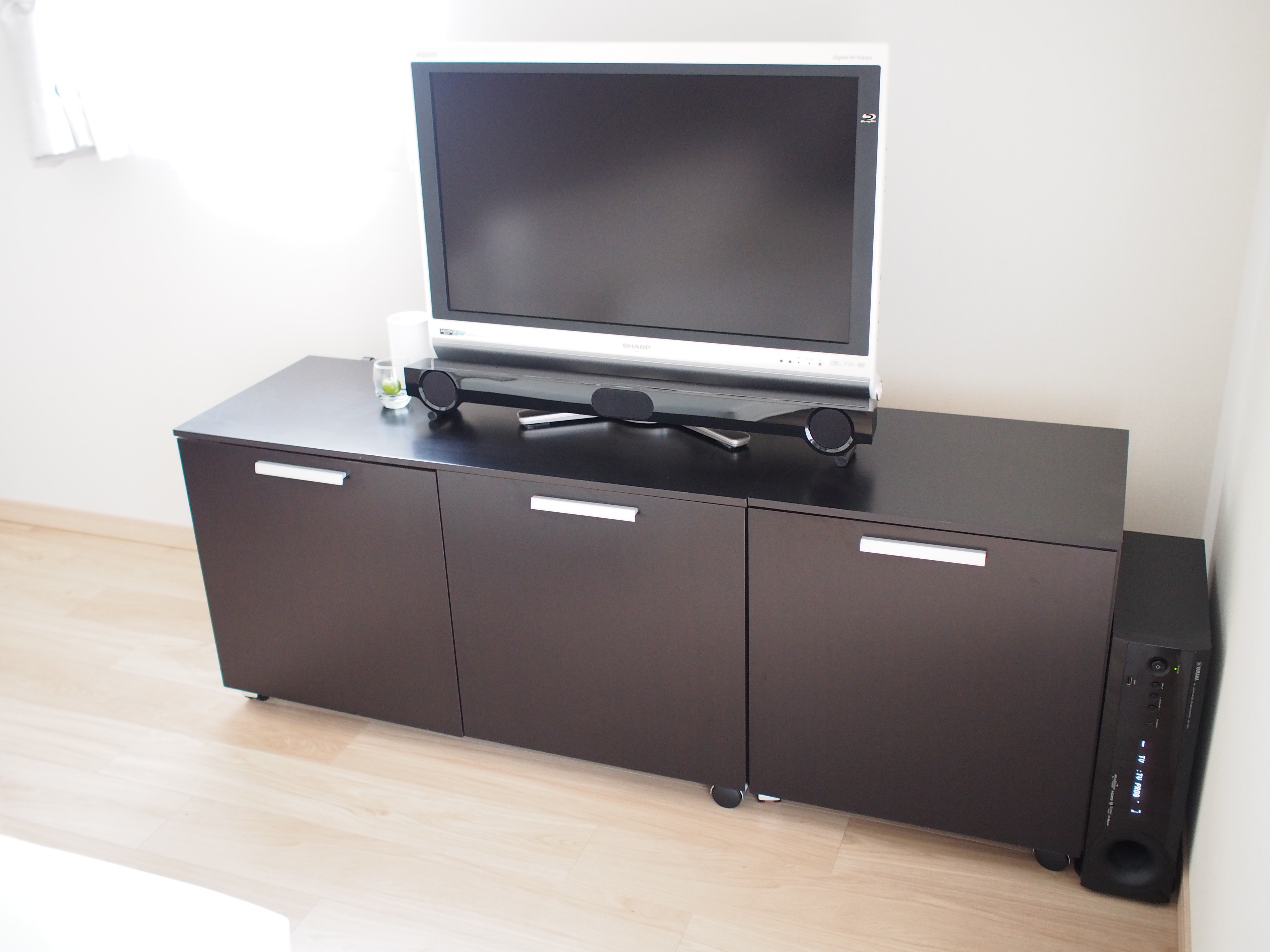 これはテレビがこうなっているわけではなく、スピーカーを別途取り付けています。たまたまウチの32インチのテレビの幅にピッタリで、我が家に来た人は「えっ、スピーカー置いてあったの?」と言います。