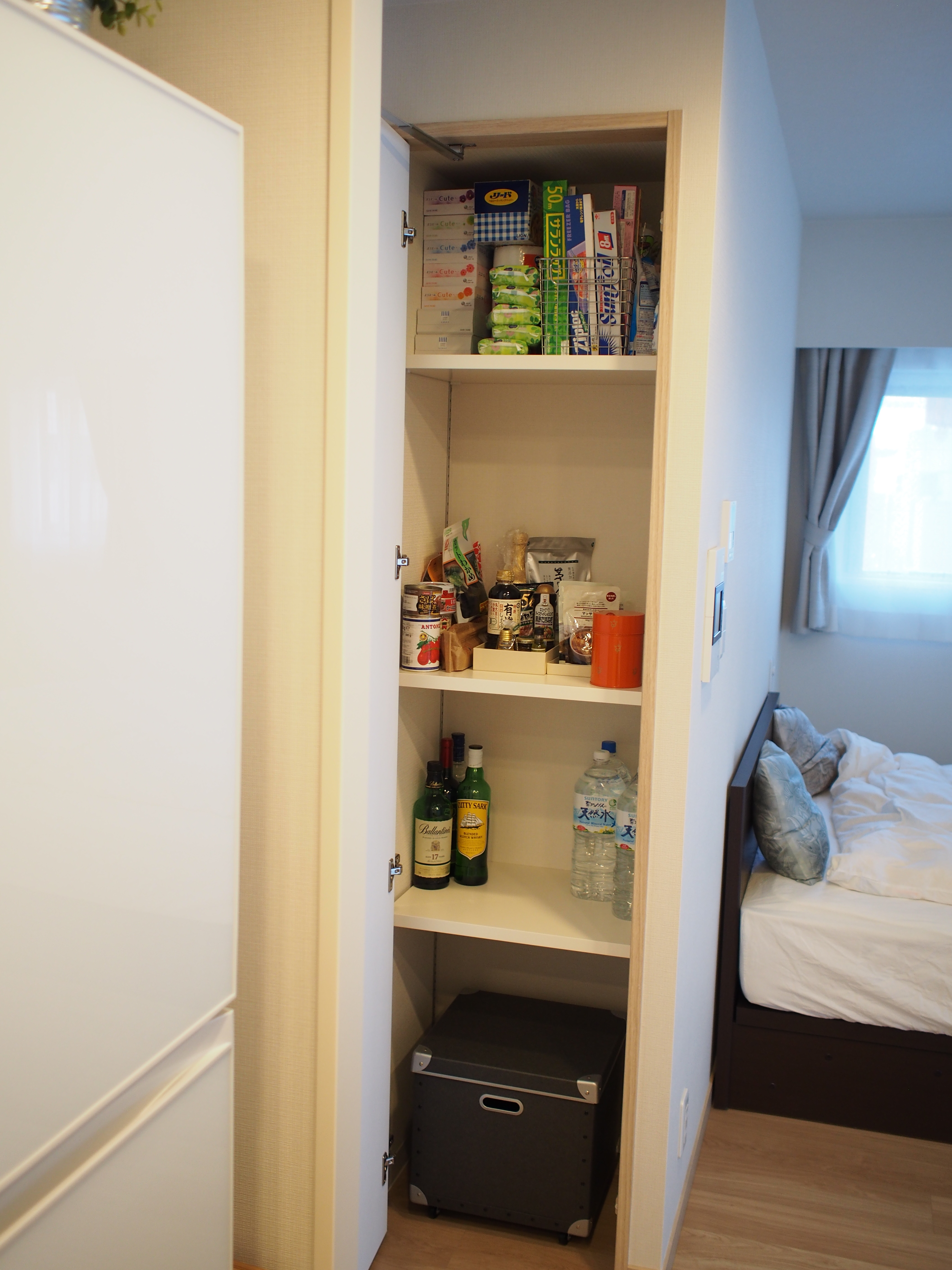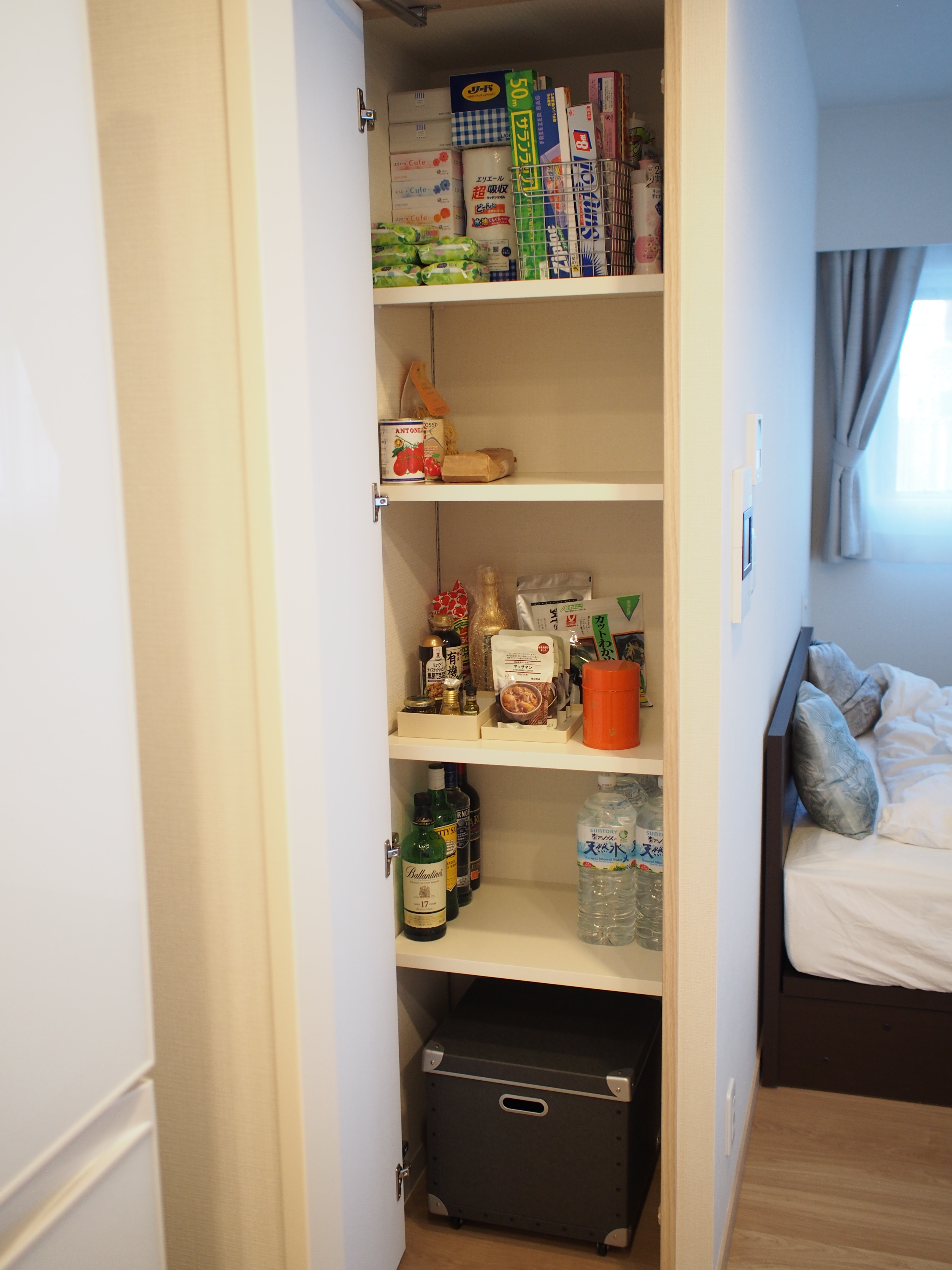 場合によっては、小さなワゴンをパントリーの中に押し込んで、そこに米や水を保管するプランも考えていました。