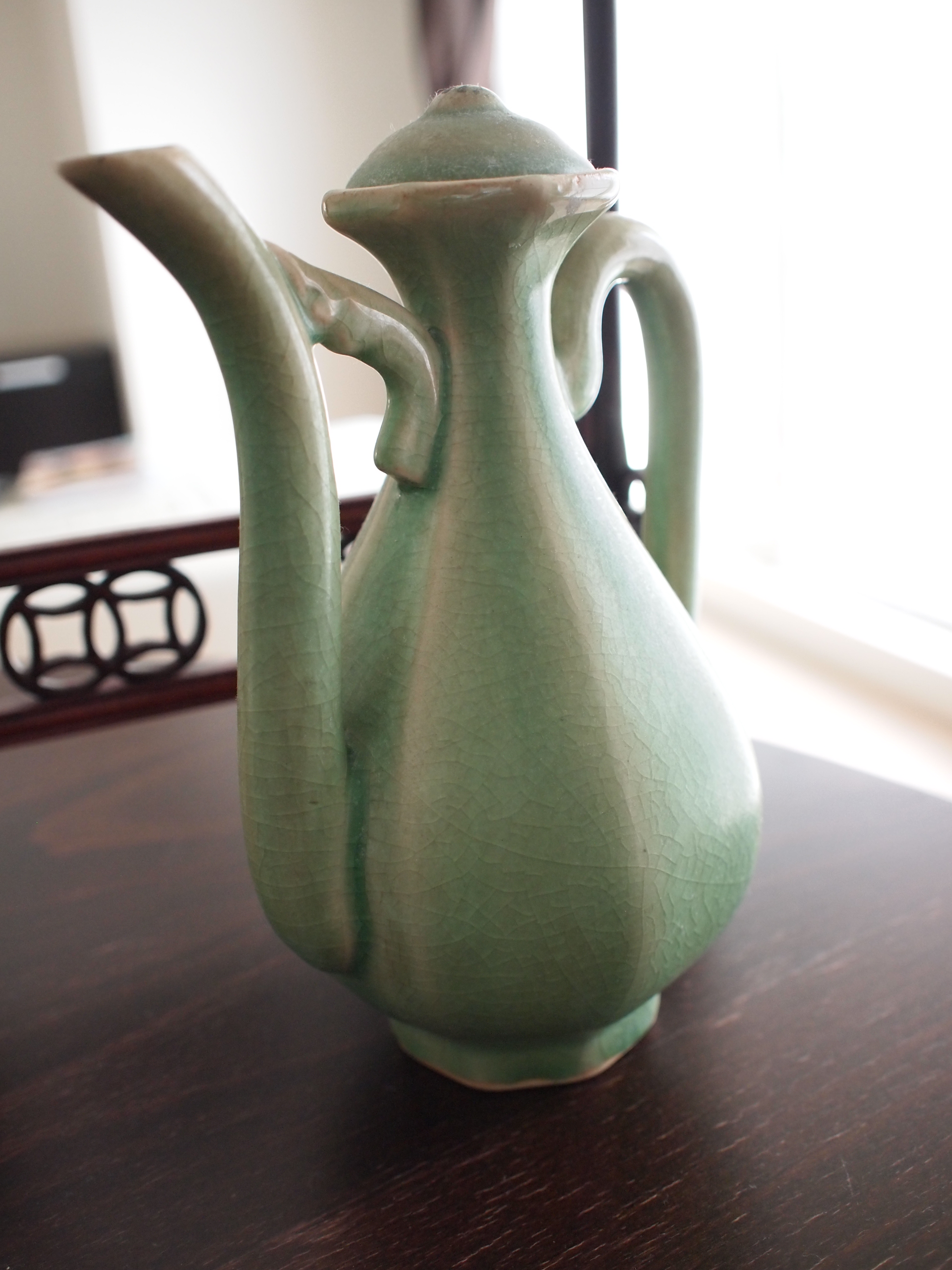 このセラドングリーンの色合いが大好きでして、写真の水差しだけでなくプレートや碗なども大量に購入してきました。
