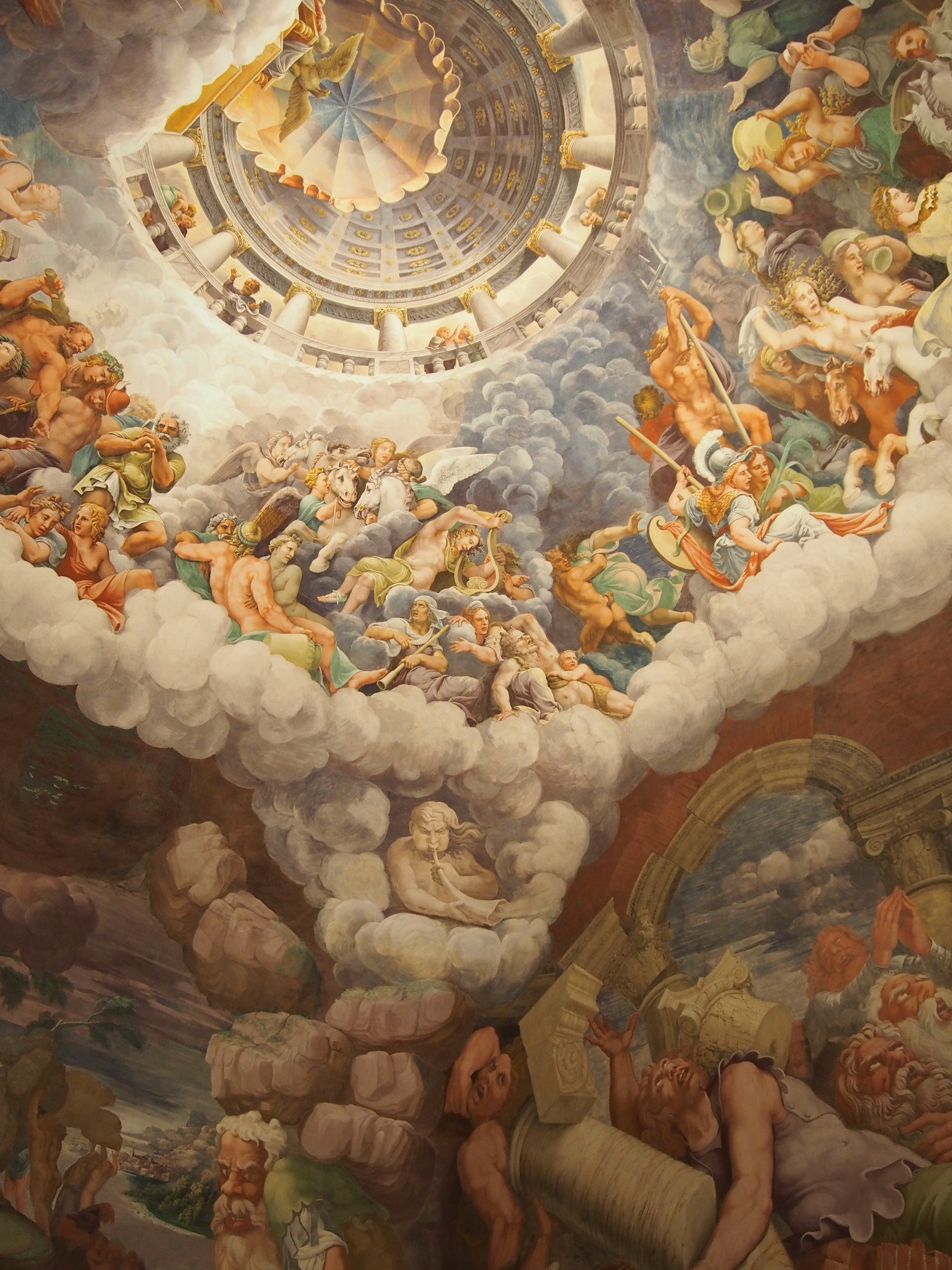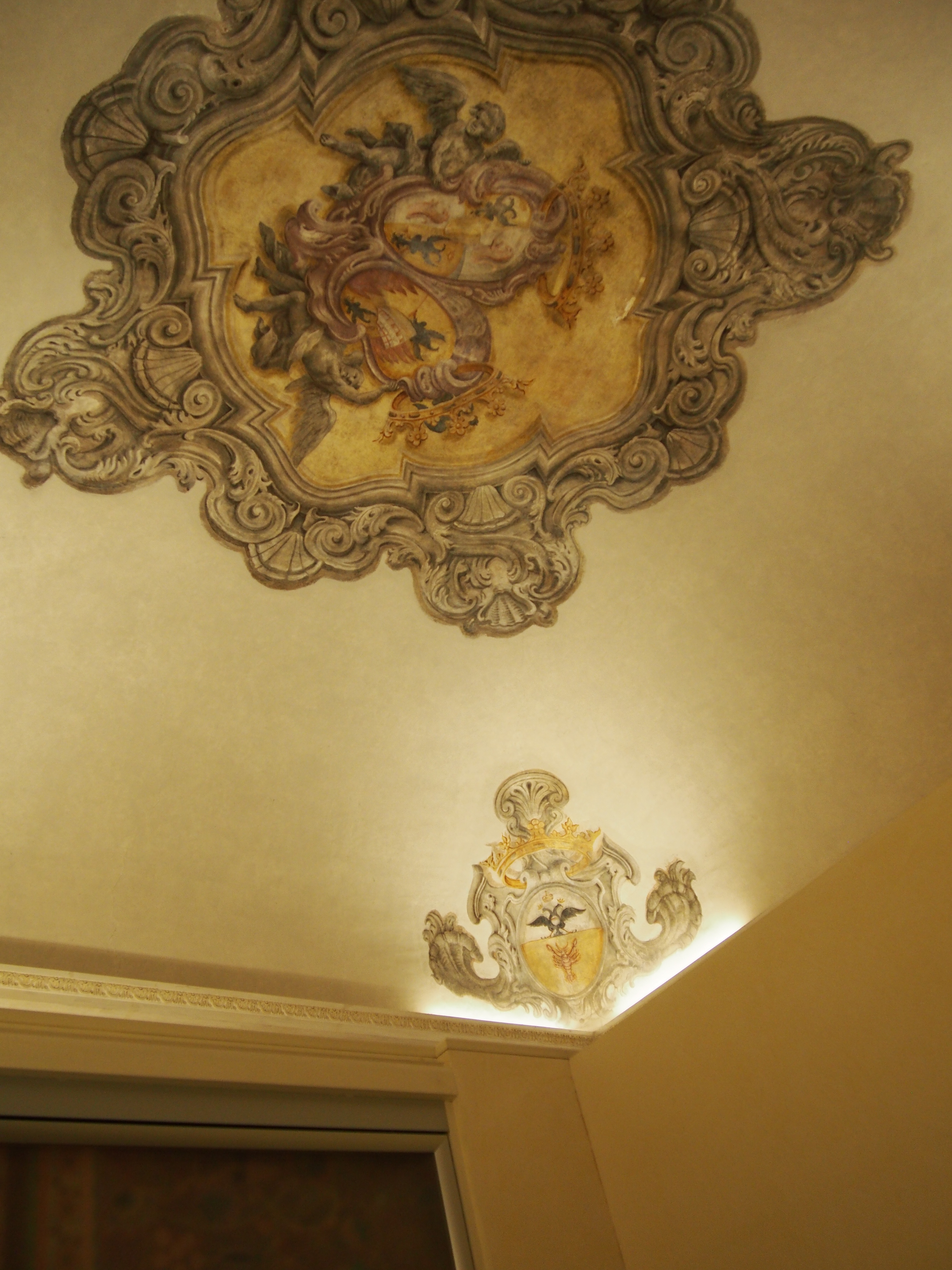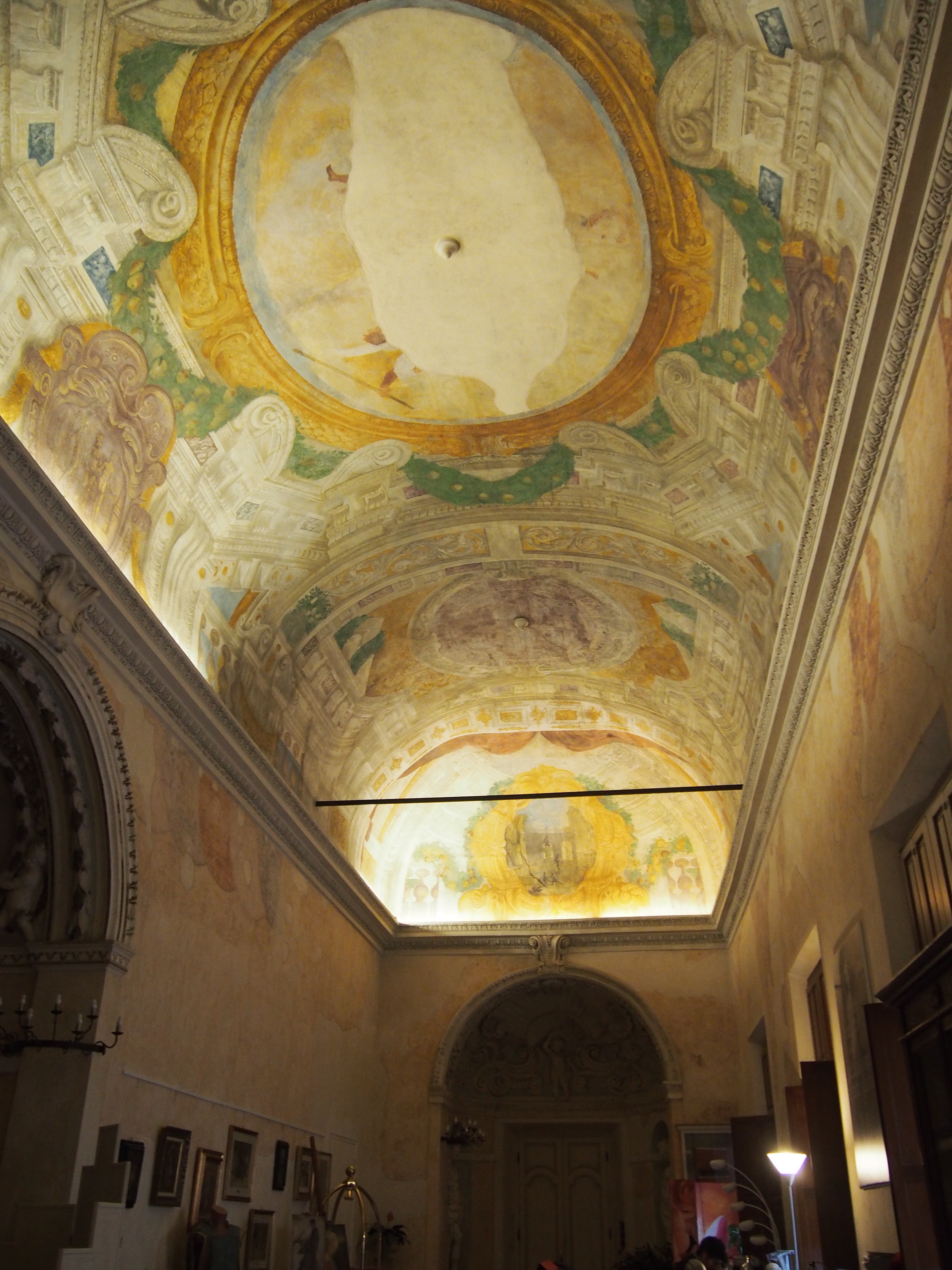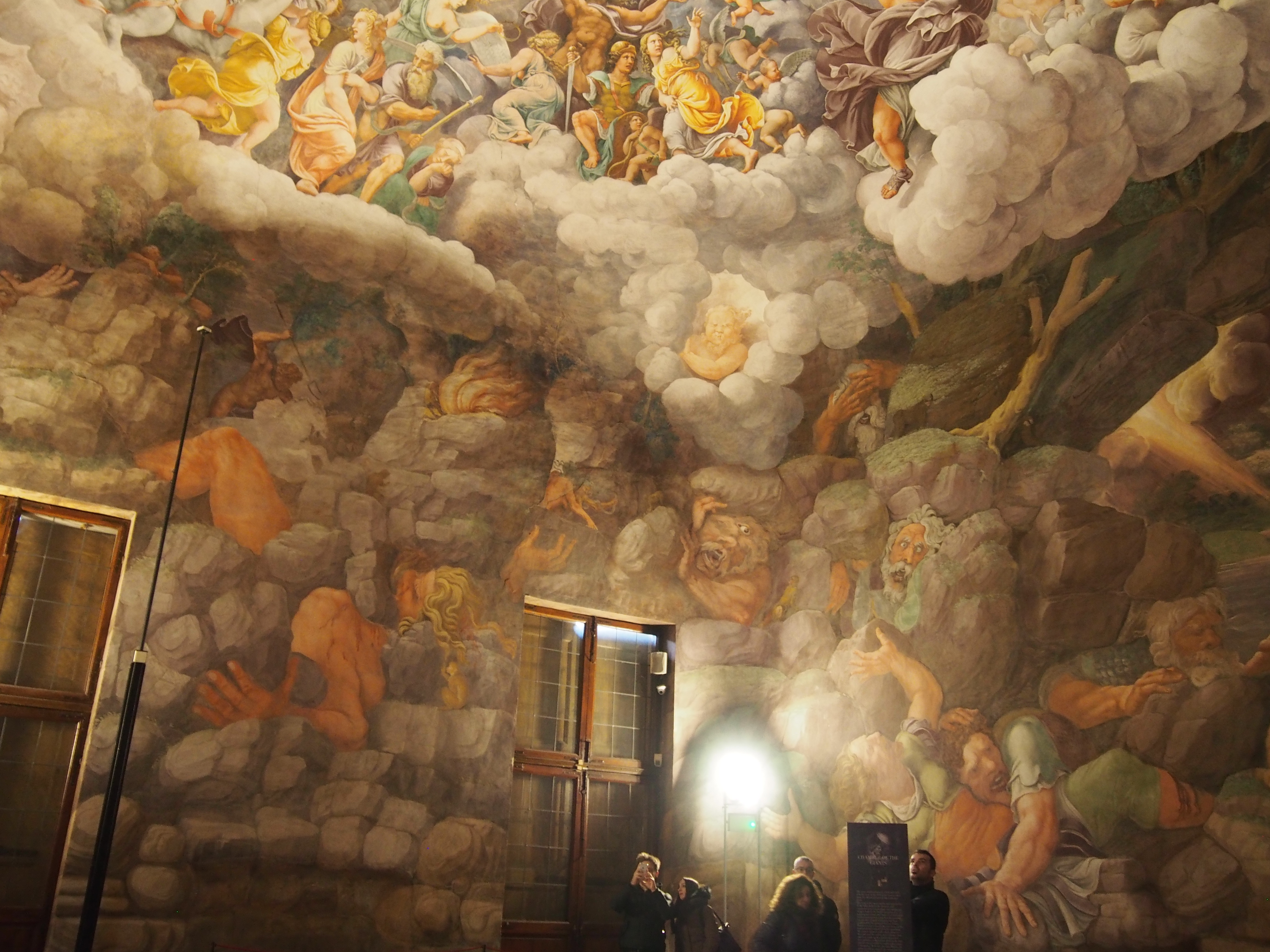 写真だとよくわかんないけど、天井と壁すべてにひとつの絵が描かれています。中に居る人間は絵の世界に入り込んでしまったような錯覚に陥る。